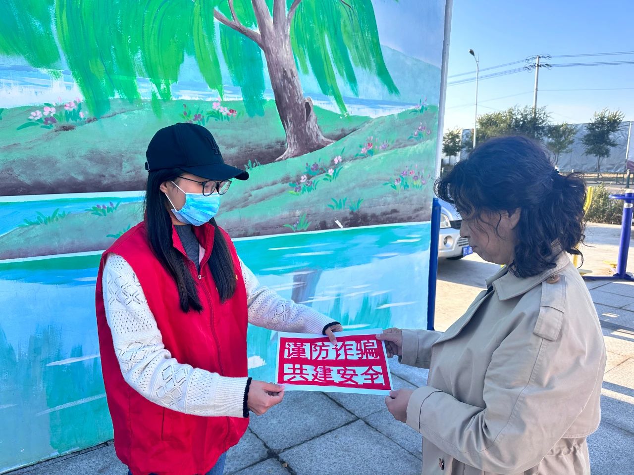 在黑通村新时代文明实践站,志愿者们走上街头,向行人分发反诈宣传册,用通俗易懂的语言向居民介绍网络诈骗惯用伎俩、作案手法和类型等相关知识,提高居民对网络诈骗的警惕性和防范意识。