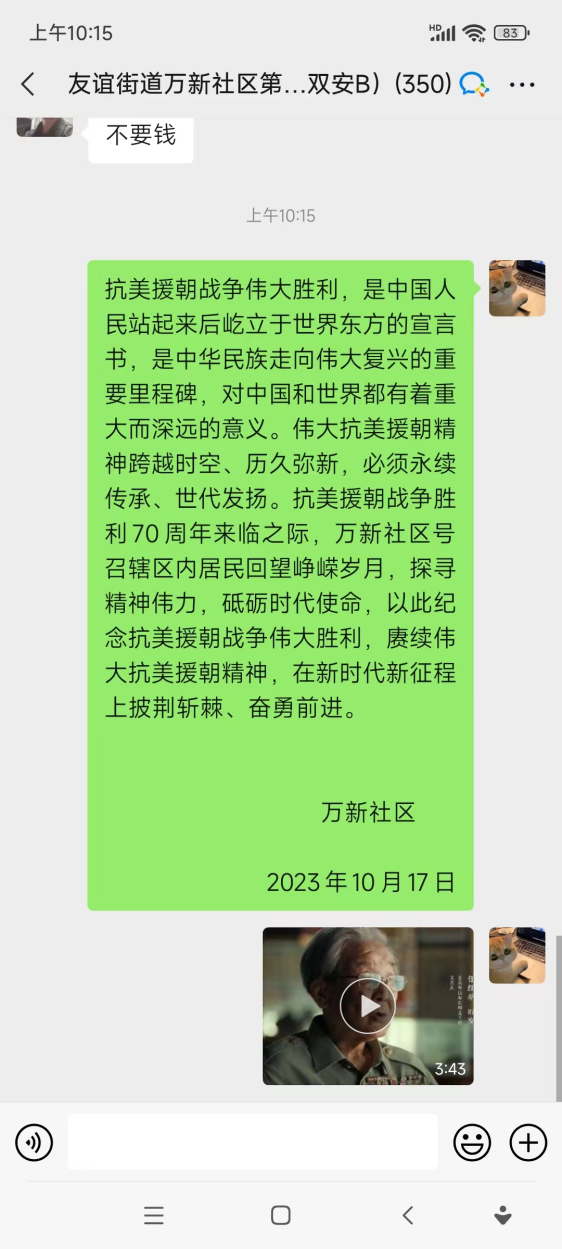 万新社区通过在网格群内转发微视频的宣传方式,缅怀伟大抗美援朝战争中献出宝贵生命的先烈们。视频虽短,但生动的画面和真实的影像资料,会让每个人都感受到革命英雄们以钢铁般的意志和英勇无畏的战斗精神,听党指挥保家卫国的爱国主义精神。加强大家对党史知识的学习,加深对抗美援朝精神的认识,通过在网格群内转发抗美援朝英雄的先进事迹,既营造致敬抗美援朝英雄弘扬抗美援朝精神的浓厚氛围,又传承红色基因,使伟大的抗美援朝精神跨越时空,历久弥新。