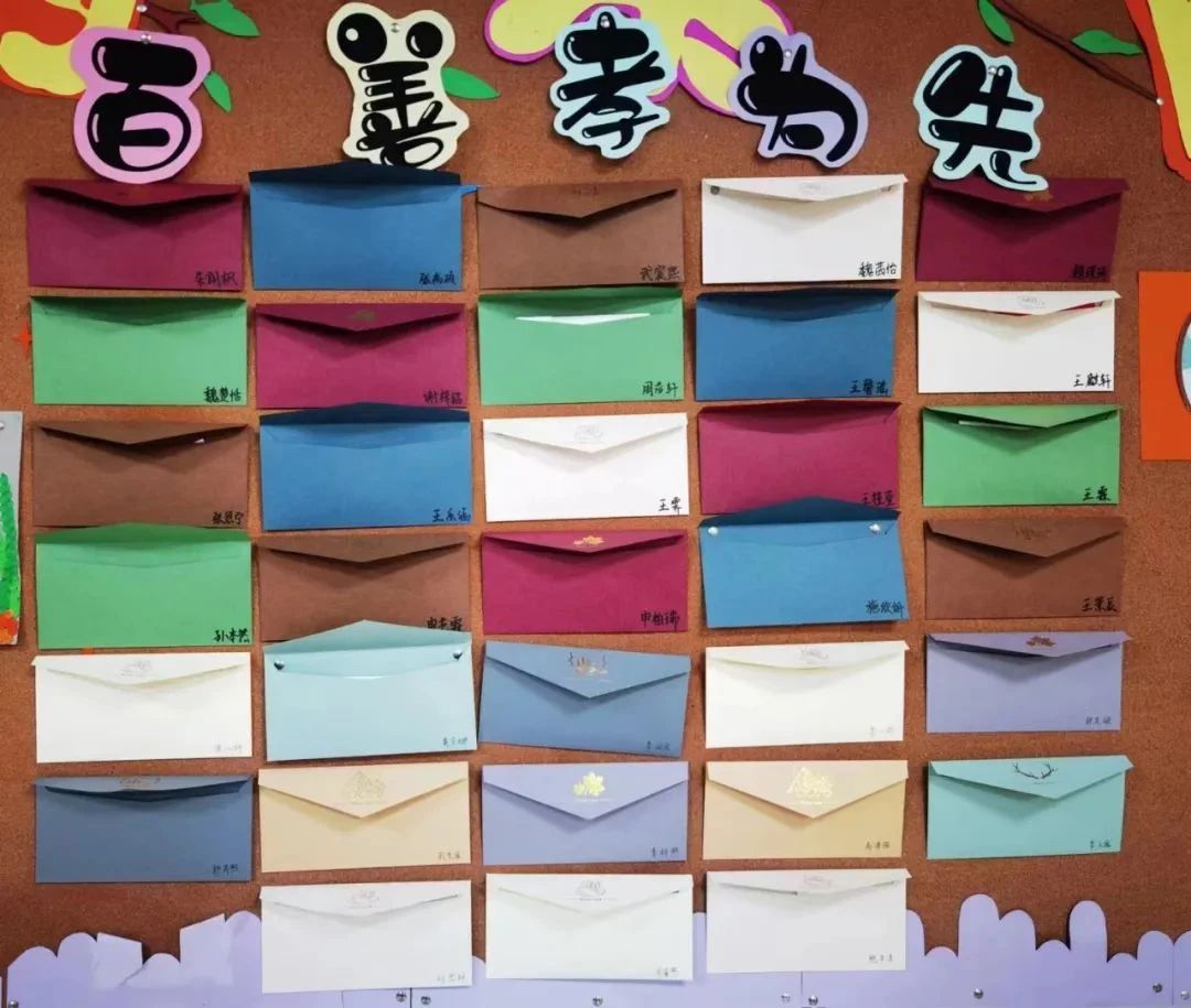小小的信封,大大的寄托,在每个班级的文化墙都有一个写着学生姓名的信封,内容有家长写下学生所做的孝顺事件,也有让家长感动的孝顺时刻。每个学期末班级内会推选出“孝之星”,参加校内评选,最后进行表彰,此项活动长期开展,贯穿每个学生的小学时光。