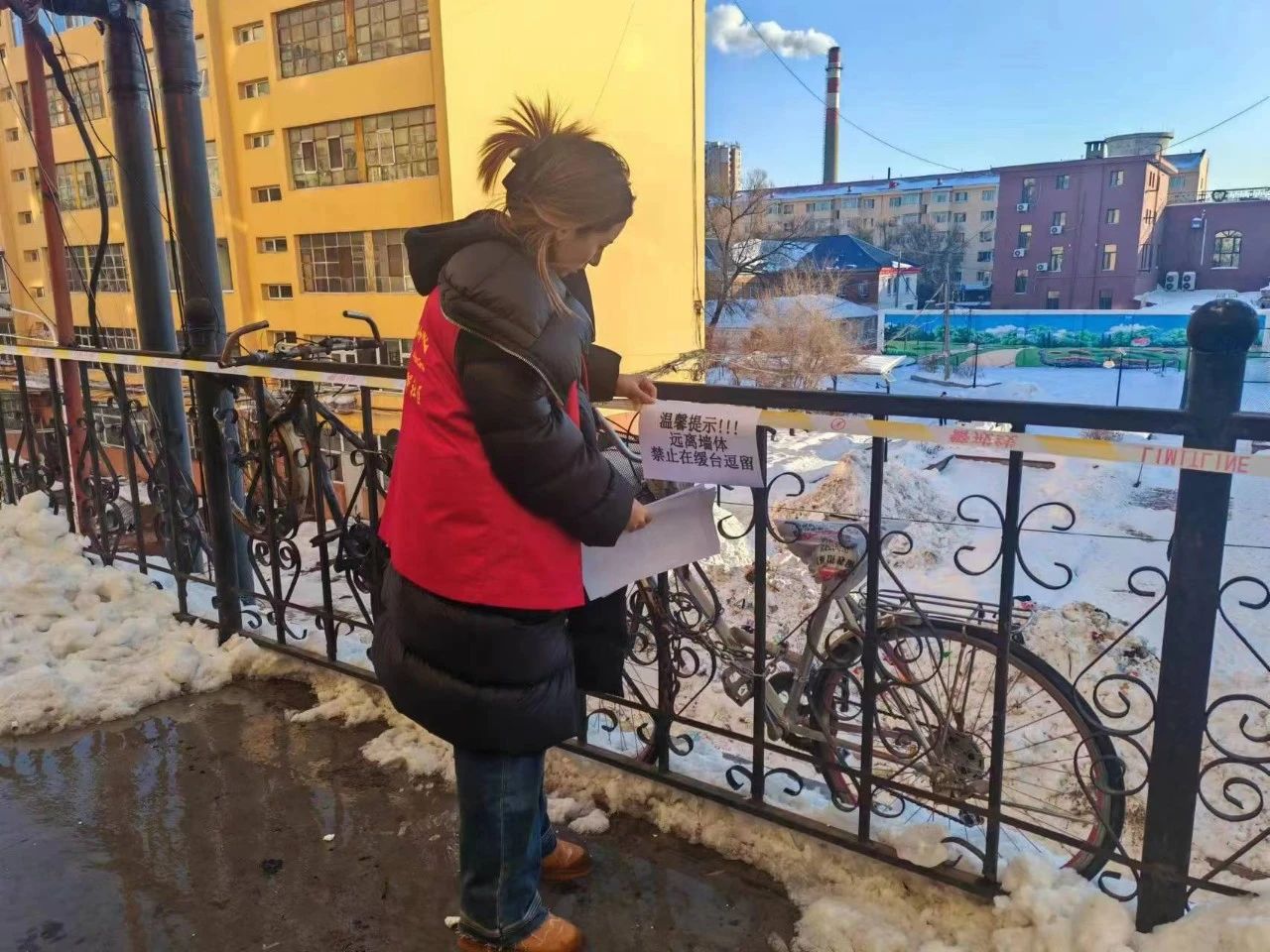 社区网格员以走访巡查的方式深入小区、商铺,重点对小区楼房、商铺房顶冰雪、房檐冰溜子有无坠冰坠雪隐患进行排查。同时,为提升辖区居民的安全警惕性,利用网格群、面对面、在辖区内明显处粘贴坠冰温馨提示等形式进行宣传,做到早告知、早警示、早预防,提醒居民注意天气变化,观察楼顶是否有积雪融化,出行远离房檐走,夜晚出行道路结冰,当心路滑,小心摔倒,防止坠冰坠雪危险给自身造成伤害。