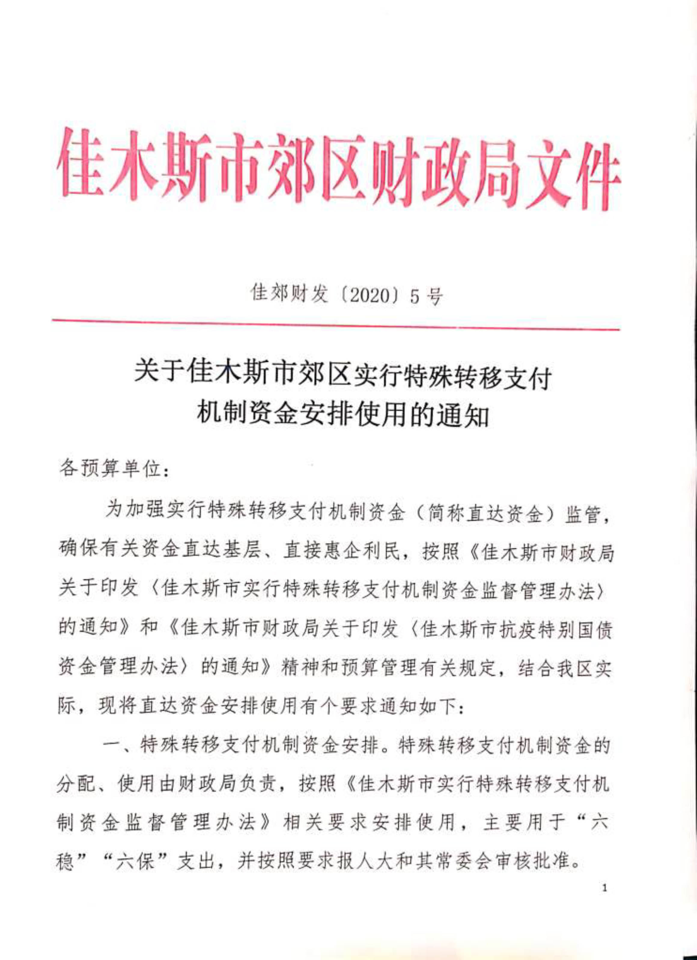 关于佳木斯市郊区实行特殊转移支付机制资金安排使用的通知