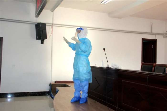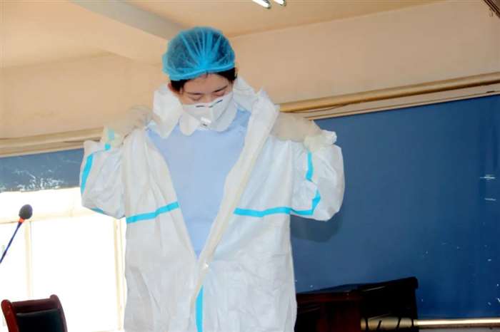 培训会邀请了市中心医院透析科医生作为讲师,重点对采样人员个人防护要求、防护用品的选择及防护服的穿脱流程进行详细解读。为加深记忆以及进一步规范防护服穿脱操作,采用了现场演示防护服的穿脱流程,直观的进行讲解,并强调防护服穿脱过程中需要注意的细节。