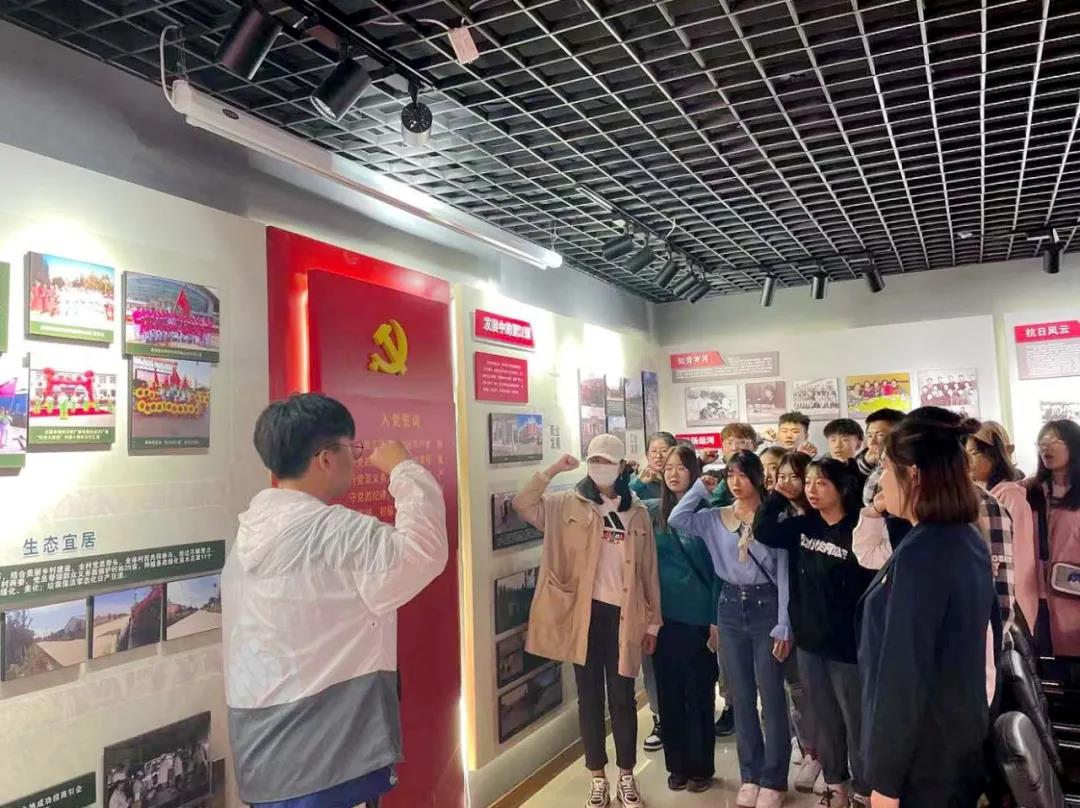 团史馆内,讲解员带领同学们回顾了新民主主义时期、社会主义时期、改革开放时期的共青团发展历程,讲述了现阶段郊区共青团发展现状。大家脚步轻缓、怀着崇敬的心情学习感悟不同历史时期的英雄事迹,感受共青团不平凡的发展历史和在革命奋斗中取得的辉煌成就。随后,全体团员青年面向团旗,高举右拳重温入团誓词,并合唱中国共青团团歌--《光荣啊,中国共青团》,深情庄重、声音铿锵。