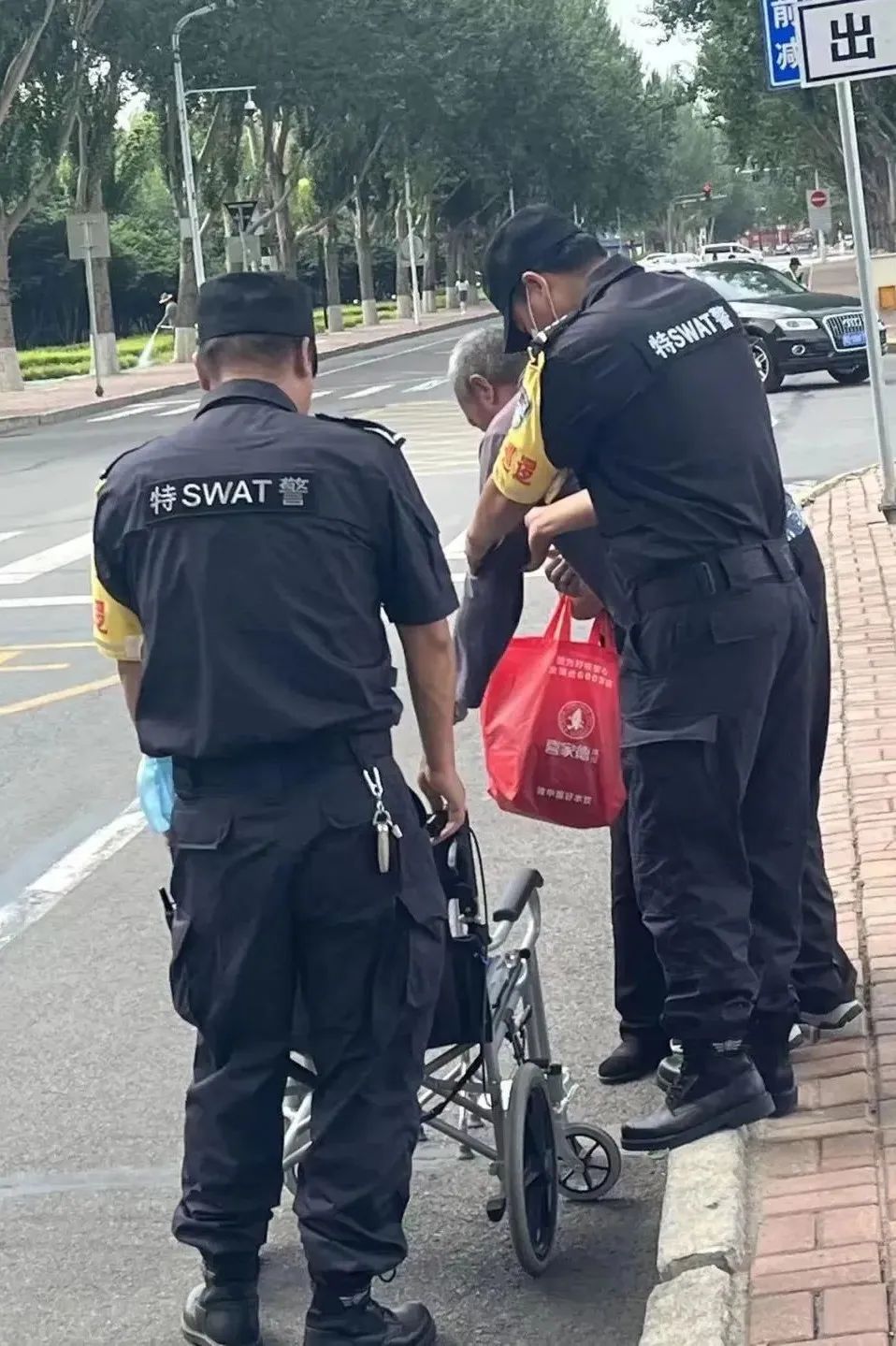 7月14日上午8时许,郊区巡特警大队在辖区勤政路附近开展执勤巡控中看见一位坐着轮椅的大爷在路口焦急的左顾右盼。由于此时是出行早高峰,路上人流、车流非常大,民警担心老人短时间内无法通过,从而引发交通安全隐患。随即上前询问到:“大爷,您这是要去哪里啊,怎么就您一个人?”原来老人是要到马路对面市财政局附近,等待家属接应。经执勤人员观察发现,老人的轮椅车是手动的,推起来很吃力。随后,执勤人员趁指示灯变灯之际,组织警力指挥过往车辆避让,同时小心翼翼的将老人推过马路到达安全地带。“到这里就行了,谢谢你们啦。”老人连连向执勤人员道谢,待其家属赶到后执勤人员返回岗位继续开展工作。