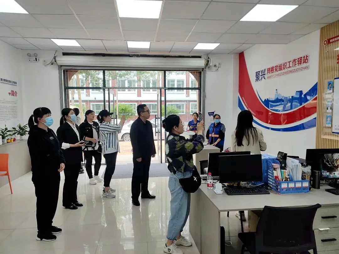 在聚兴商业网格党组织驿站,调研团听取了郊区打造商业网格党组织工作驿站的创新做法,了解驿站的服务理念、服务方向、服务模式,特别是聚兴网格党组织驿站红色教育平台的特色做法,并从商业网格划分和新业态新就业群体服务等方面进行了深入交流。