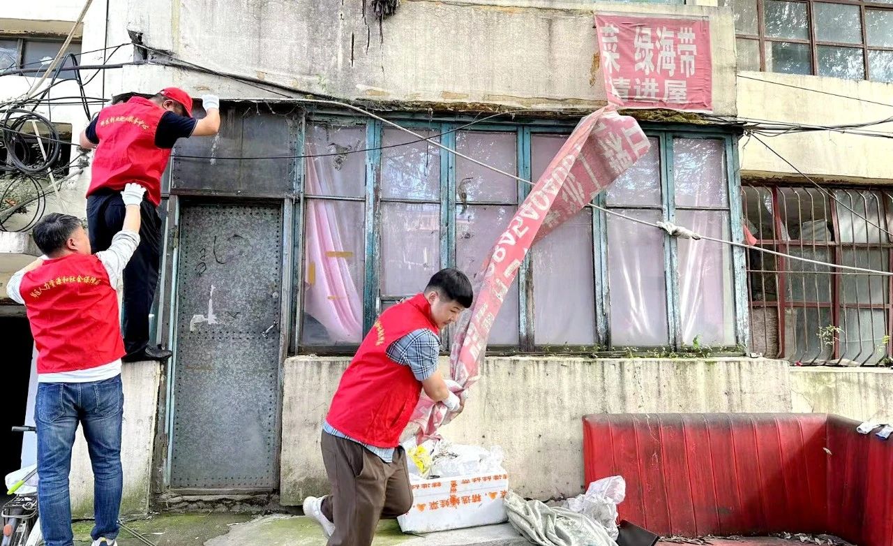 活动中,党员干部志愿者身穿红色马甲,头戴红色帽子,手拿铲子、夹子、锹等工具来到荣军社区与社区的工作人员一起到小区内进行清理墙面“牛皮癣”。