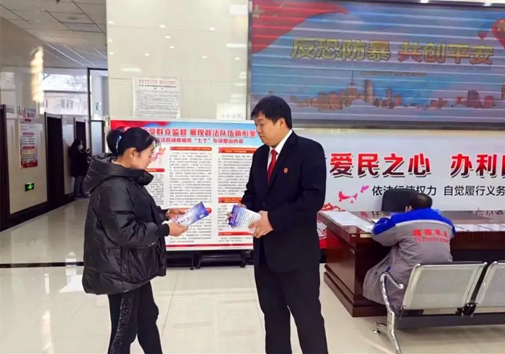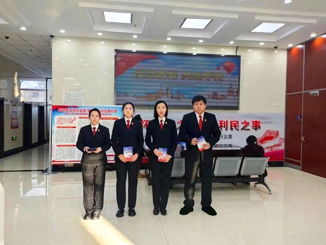 2024年1月1日是《中华人民共和国反恐怖主义法》颁布八周年。为进一步普及法律知识,切实加强群众对《中华人民共和国反恐怖主义法》的认识,12月27日,郊区人民法院刑事审判庭干警在诉讼服务大厅开展以“反恐防暴共创平安”为主题的普法宣传活动。