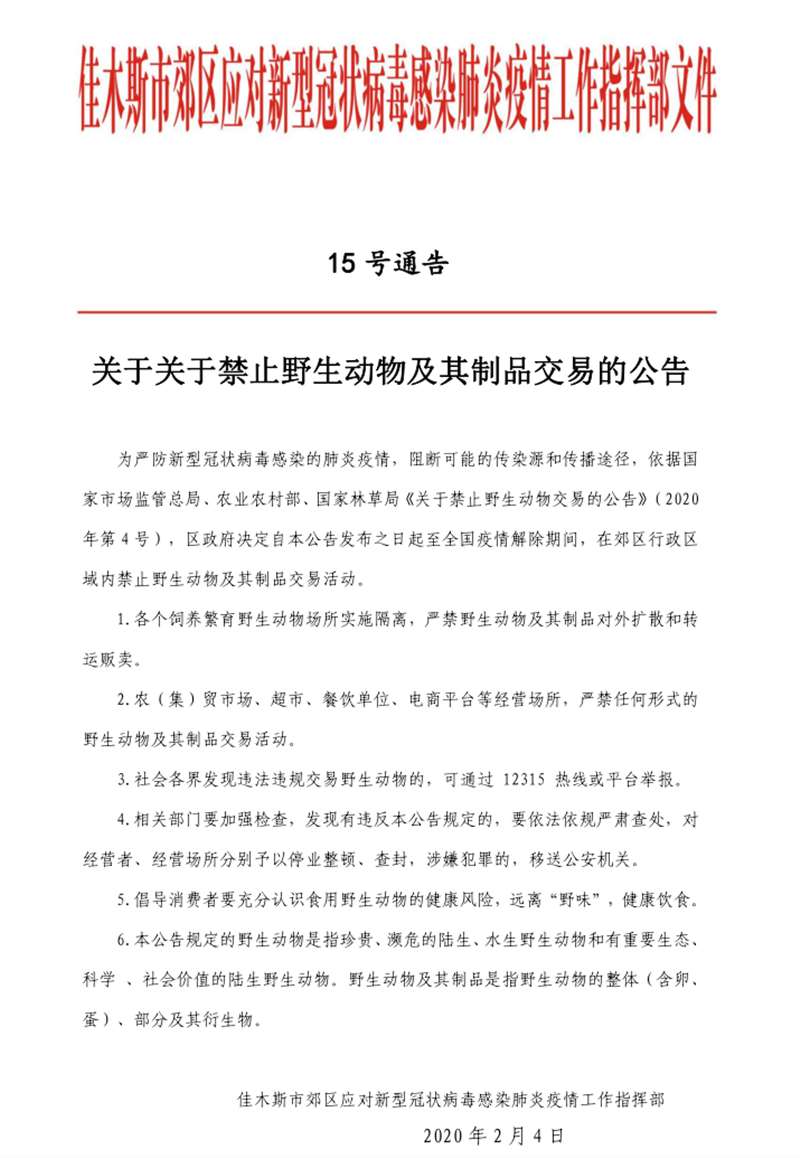 佳木斯市郊区应对新型冠状病毒感染肺炎疫情工作指挥部文件15号通告