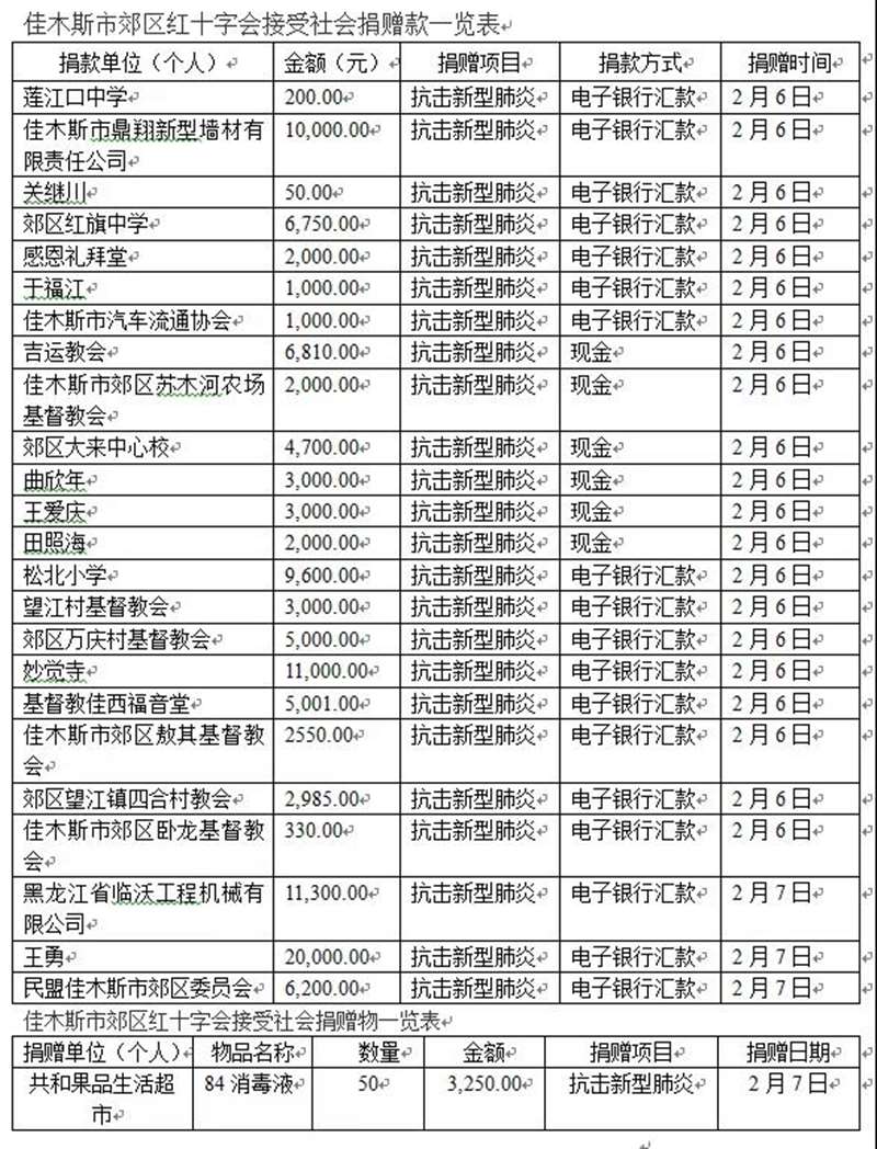 截至2020年2月7日15时,佳木斯市郊区红十字会共接受用于新型冠状病毒感染的肺炎疫情防控社会捐赠款、物合计122,726.00元。其中接受资金119,476.00元,物资价值3,250.00元。