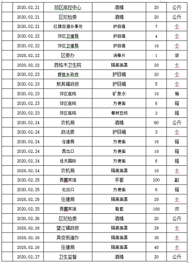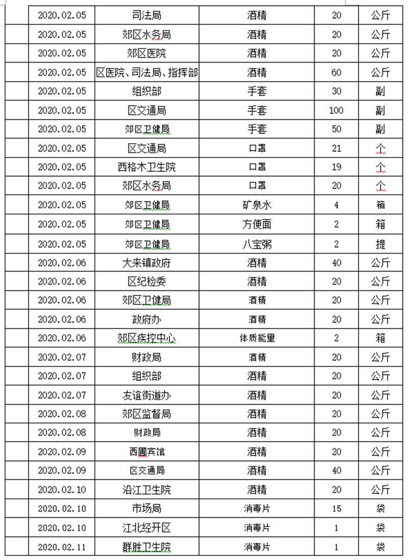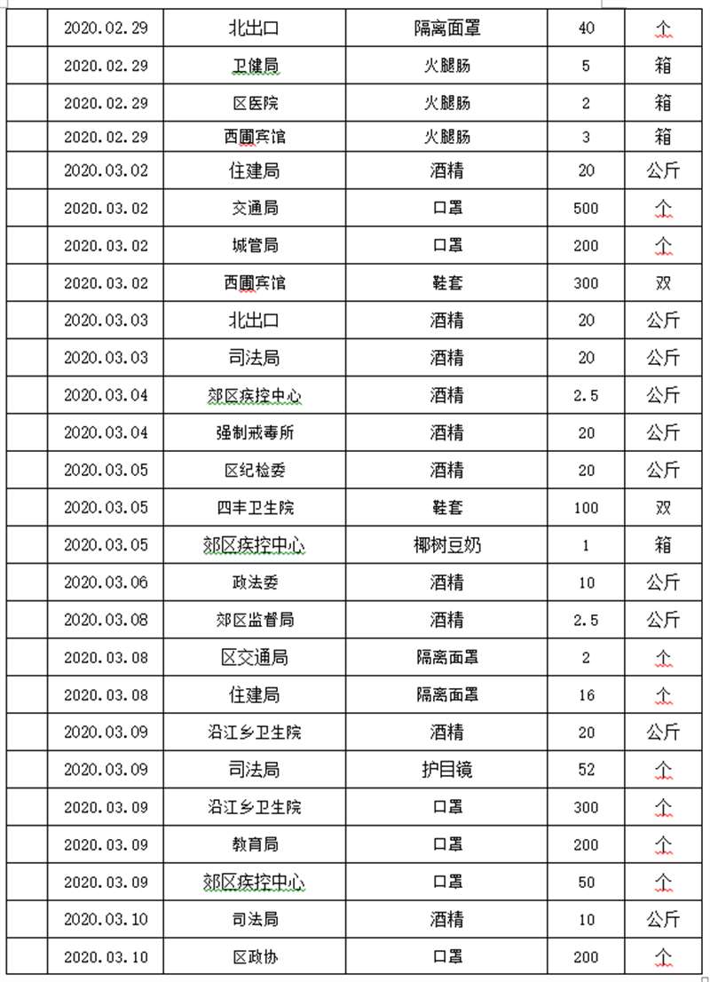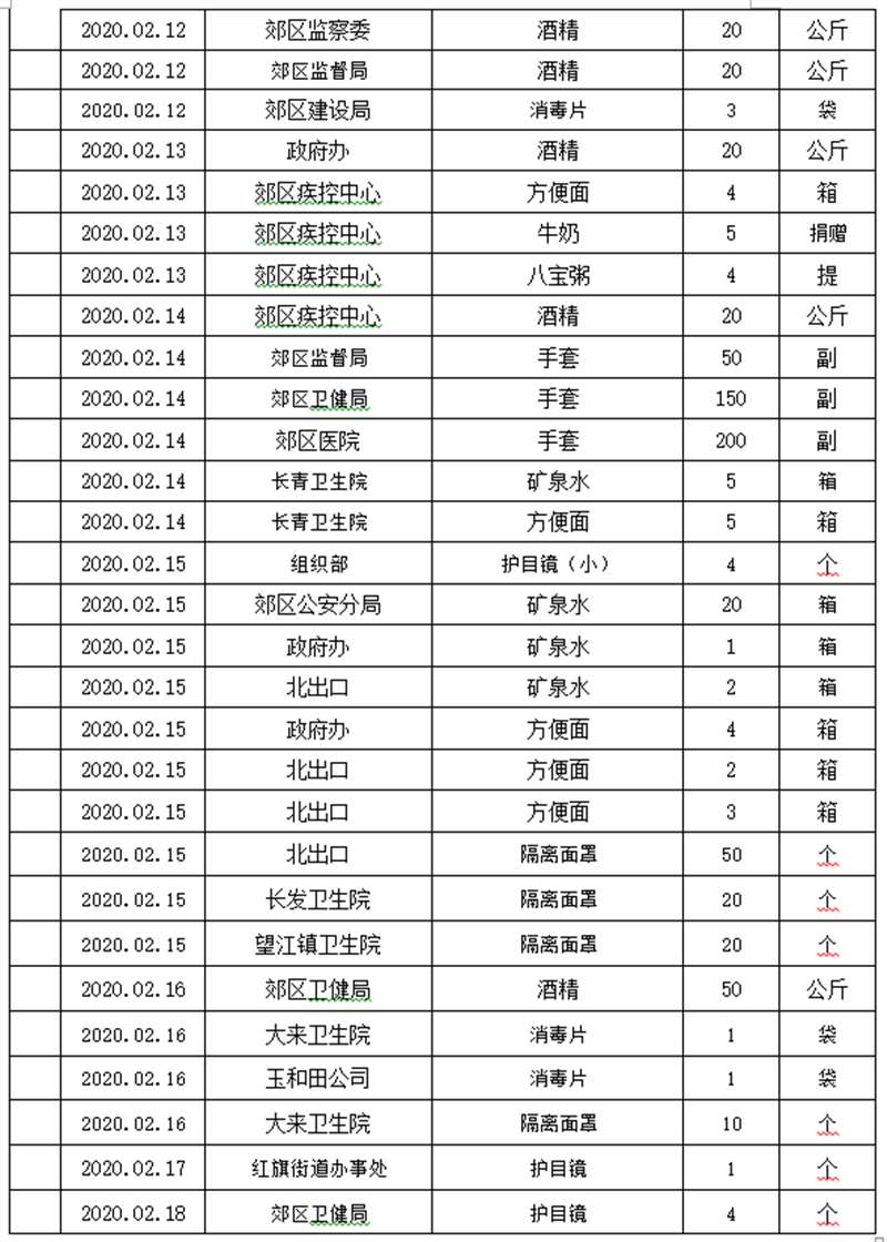 郊区疾病预防控制中心发放社会捐赠物资一览表