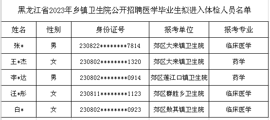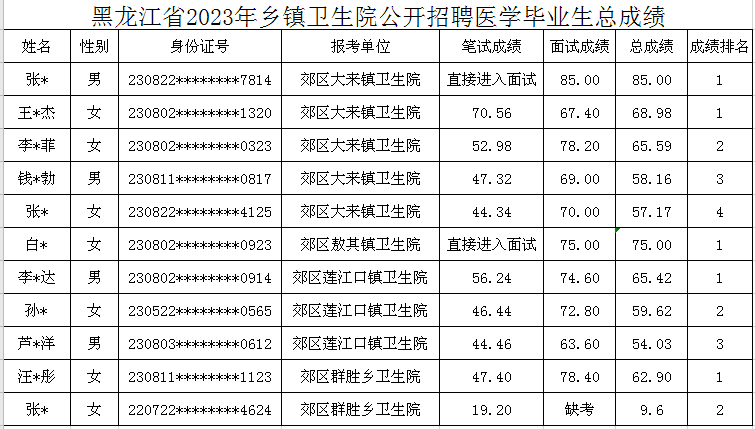 根据《黑龙江省2023年乡镇卫生院公开招聘医学毕业生公告》,招聘笔试和面试环节已结束,现将考试总成绩及拟进入体检人员名单予以公布。如对公示有异议,可在公示期内反映,逾期不予受理。反映情况和问题必须实事求是,应签署真实姓名;对线索不清的匿名信和匿名电话,不予受理。公示期满不予受理,请考生持续关注佳木斯市郊区人民政府网站或电话通知。