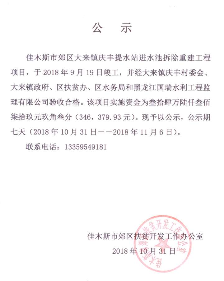 关于郊区大来镇庆丰提水站进水池拆除重建工程竣工验收公示