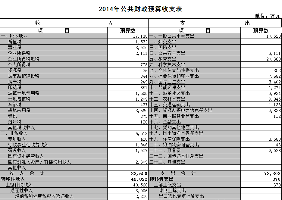一、2014年预算编制说明 2014年预算安排的指导思想是:以十八届三中全会精神为统领,以财政体制改革为动力,全面落实区委九届三次全会精神,继续强化税收征管,应收尽收;继续优化支出结构,着力改善民生;继续拓宽融资渠道,盘活资产;继续强化监督,加大投入,促进经济持续健康发展、社会和谐进步。 (一)收支安排基本情况 全区公共财政总收入72672万元。其中,公共财政收入23650万元,增收2812万元,增长13.5%,占总收入的32.5%;上级补助收入40560万元,占总收入的55.8%;上年结余收入8462万元,占总收入的11.6%。全区公共财政总支出72672万元。其中,公共财政支出72302万元,比上年预算数减支9981万元,减少12.1%;专项上解支出370万元。 (二)公共财政预算支出重点民生资金安排 (1)教育支出20360万元,占公共财政预算支出的28.02%。 (2)文化体育与传媒支出352万元,占公共财政预算支出的0.48%。 (3)社会保障和就业支出7682万元,占公共财政预算支出的10.57%。 (4)医疗卫生支出5402万元,占公共财政预算支出的7.43%。 (5)节能环保支出1274万元,占公共财政预算支出的1.75%。 (6)城乡社区事务支出3924万元,占公共财政预算支出的5.39%。 (7)农林水事务支出9945万元,占公共财政预算支出的13.68%。 (8)住房保障支出3580万元,占公共财政预算支出的4.93%。 二、“三公”经费预算汇总情况说明 经汇总,2014年我区区直安排的“三公”经费预算257万元。其中,公务用车运行费预算124万元,公务接待费预算133万元。 附表:公共财政收支预算表及区直“三公”经费支出预算汇总表