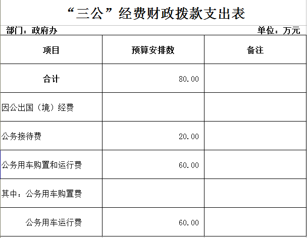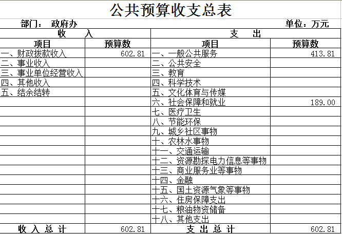 一、政府办主要职能 (一)负责承担区政府大型综合材料和领导讲话的起草、审核、修改工作等。 (二)负责区政府党组会议、常务会议、区长办公会议、全体成员会议、区政府重大会议的会务工作和区政府重大活动组织安排。 (三)督促检查区政府重要工作部署,会议决定事项、领导重要批示的执行情况。 (四)负责人大代表建议、政协委员提案办理及办理情况的反馈工作。 (五)协助区政府领导审核或组织起草义区政府、区政府办公室名义发布的各类文件等。 (六)负责区政府总值班安排和公务接洽,特别是做好突发事件和重大事故情况的反映和综合协调。 (七)负责区政府办公室财务工作。 (八)负责区四个班子领导的接待服务工作,后勤工作和离退休人员管理、服务工作:负责区政府办公楼及二办的管理和安全保卫工作。 (九)负责办公室及直属单位的人事劳资、干部教育 职称评聘、纪律检查等。 (十)认真贯彻执行国家、省、市的侨务工作的方针、政策和有关规定,开展好各项侨务工作。 (十一)贯彻执行国家有关民族、宗教政策和法律、法规,并开展好管理教育工作,检查民族、宗教政策和法律、法规的执行情况。 (十二)负责全区规范性文件的审核、制定及监督贯彻执行情况。 (十三)承办区政府交办的其它事项。 二、 2014年政府办部门预算总体情况 预算总收入602.81万元,其中:财政拨款收入602.81万元。预算总支出602.81万元,其中:一般公共服务支出413.81万元,社会保障和就业支出189万元。(工资福利支出159.73万元,商品和服务支出237.08万元,对个人和家庭补助支出206万元)。 附表: 1、《公共预算收支总表》 2、《公共预算支出表》 3、《三公经费财政拨款支表》
