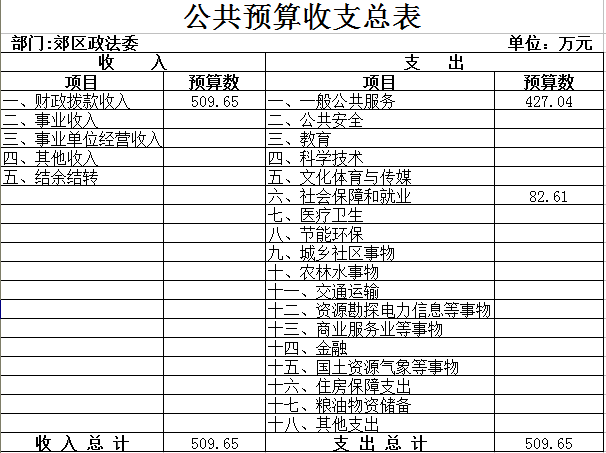预算总收入509.65万元,其中:财政拨款收入509.65万元。预算总支出509.65万元,其中:一般公共服务支出427.04万元,社会保障和就业支出82.61万元。(工资福利支出375.24万元,商品和服务支出34.72万元,对个人和家庭补助支出99.69万元)。