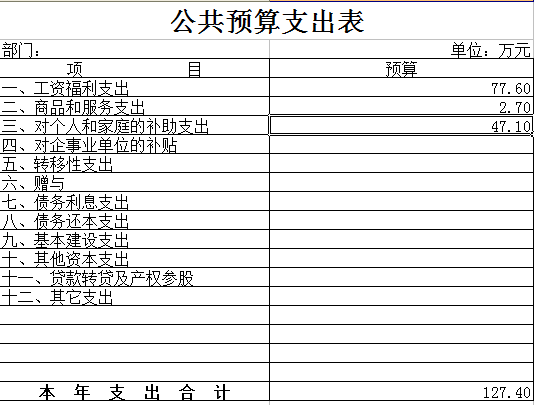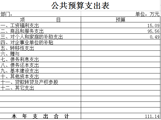 预算总收入127.4万元,其中:财政拨款收入127.4万元。预算总支出127.4万元,其中:一般公共服务支出85万元,社会保障和就业支出42.4万元。(工资福利支出77.6万元,商品和服务支出2.7万元,对个人和家庭补助支出47.1万元)。