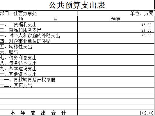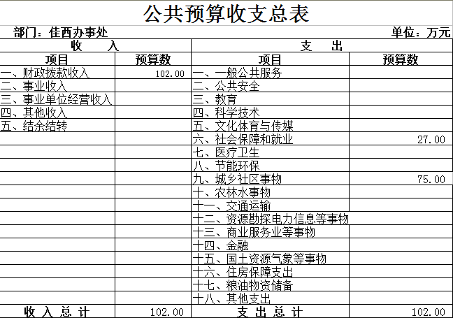 一、主要职能 1、认真贯彻党和国家对城市职责管理的各项方针政策,加强社区建设,使社区成为联系人民群众的纽带。 2、负责辖区内党建、群团工作。 3、负责辖区内民政事业工作,组织救助特困居民,开展优抚工作。 4、开展社会主义法制教育。 5、负责辖区内环境卫生管理,开展经常性的爱国卫生运动。 6、贯彻落实国家有关计划生育的政策和法规,并对辖区内的执行情况进行监督检查和指导。 二、预算总体情况 预算总收入102万元,其中:财政拨款收入102万元。预算总支出102万元,其中:社会保障和就业支出27万元,城乡社区事务支出75万元,。工资福利支出45万元,商品和服务支出27万元,对个人和家庭补助支出30万元。 三、公开表格有关说明 1、《公共预算收支总表》 该表反映本单位收入来源及支出功能分类科目的总体情况。 2、《公共预算支出表》 该表反映本单位支出功能分类科目的总体情况。 3、《三公经费财政拨款支表》 该表反映本单位因公出国(境)经费、公务接待费及公务用车购置和运行费预算安排数。 四、2014年预算情况表