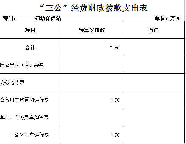 该表反映本单位因公出国(境)经费、公务接待费及公务用车购置和运行费预算安排数。