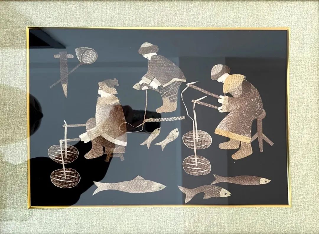 鱼皮画:鱼皮画是赫哲族特有的文化艺术,赫哲族传统的图案艺术非常发达,他们常常在用鱼皮、兽皮制作的衣服、鞋帽、被褥上,绣制各种云纹、花草、蝴蝶及几何形图案等。鱼皮镂刻和剪贴画曾被称为“无纸剪纸”。通过对鱼皮的粘贴和镂刻,以独特的形式,从不同角度表现了赫哲人民的聪明才智和审美的群体意识。经过当代艺术工作者的加工,已经具有了全新的艺术形式和更加丰富的文化内涵。