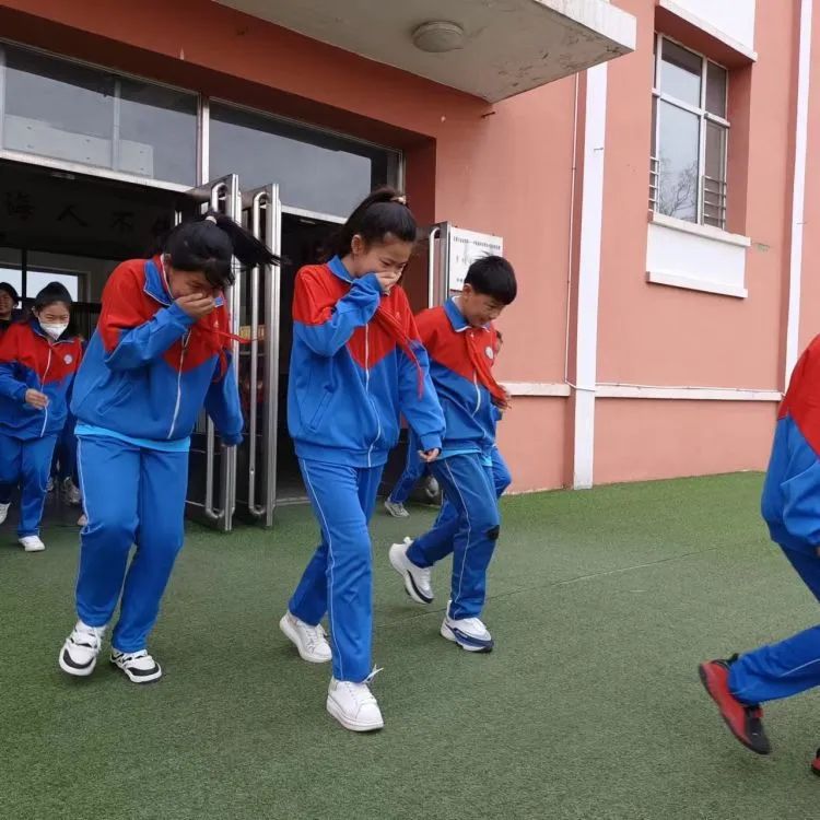 演习中,学校拟定火灾发生时出现断电情况,以警报声响起为信号,在教职人员的指挥下,学生有序并以弯腰姿势同时捂住口鼻逃离火灾现场。
