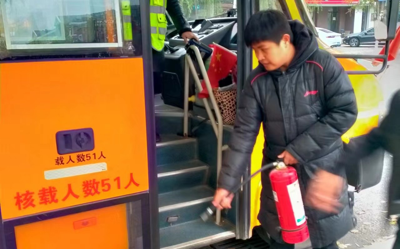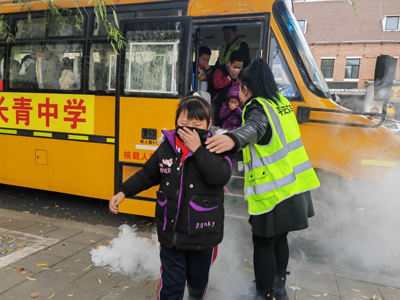 演练中,假定校车在行驶途中车外浓烟四起,司机迅速停稳校车、打开前后门。校车上的同学在跟车员的指引下,迅速解开安全带,捂住口鼻,按照先外后里、先右后左的顺序有序撤离。下车后,学生们撤离到离车10米以上的地方暂避火情,跟车员迅速清点人数,确保所有人员安全撤离。同时学校救护队迅速参与扑救。