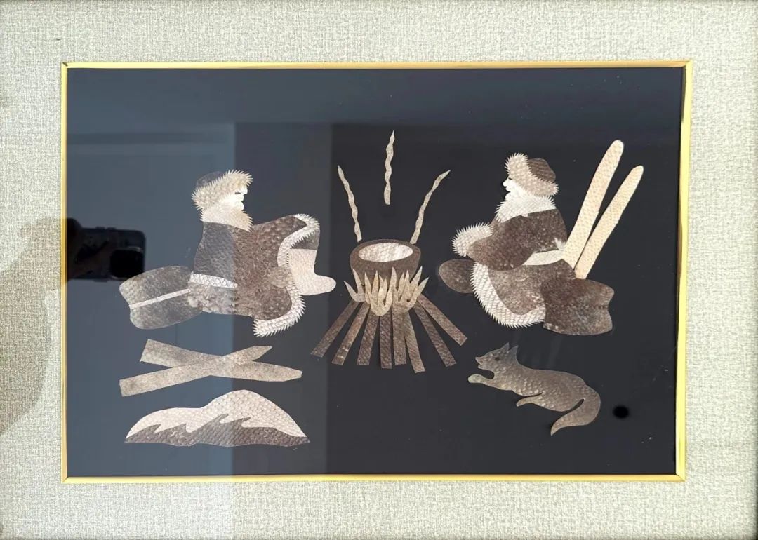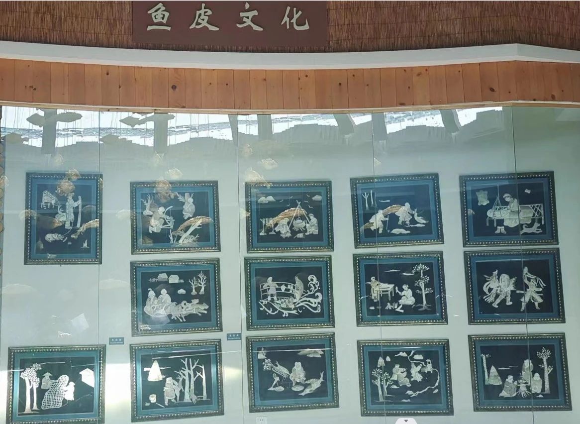 鱼皮画:鱼皮画是赫哲族特有的文化艺术,赫哲族传统的图案艺术非常发达,他们常常在用鱼皮、兽皮制作的衣服、鞋帽、被褥上,绣制各种云纹、花草、蝴蝶及几何形图案等。鱼皮镂刻和剪贴画曾被称为“无纸剪纸”。通过对鱼皮的粘贴和镂刻,以独特的形式,从不同角度表现了赫哲人民的聪明才智和审美的群体意识。经过当代艺术工作者的加工,已经具有了全新的艺术形式和更加丰富的文化内涵。