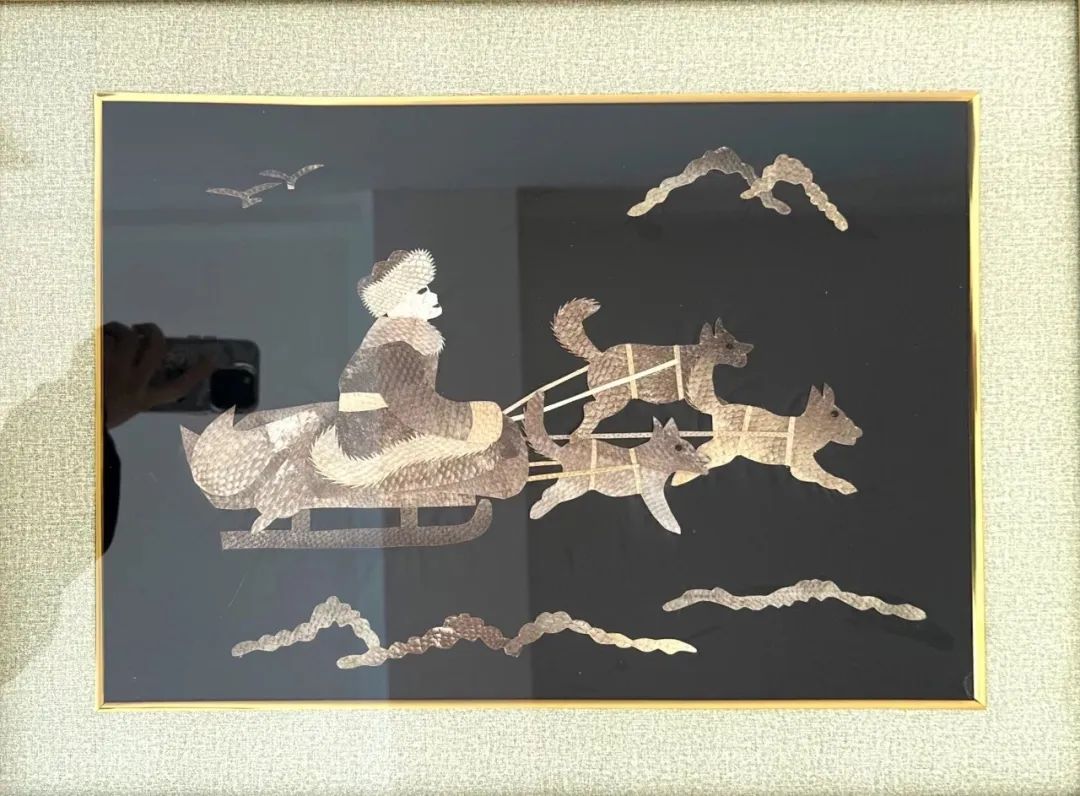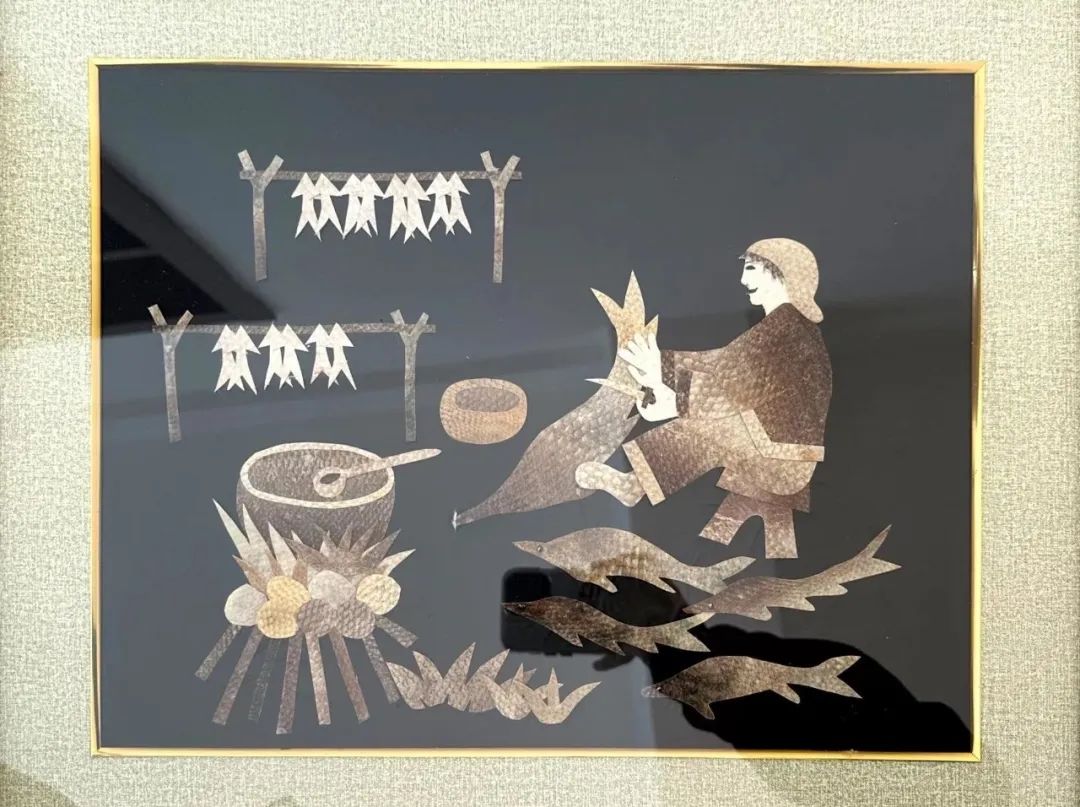 鱼皮画:鱼皮画是赫哲族特有的文化艺术,赫哲族传统的图案艺术非常发达,他们常常在用鱼皮、兽皮制作的衣服、鞋帽、被褥上,绣制各种云纹、花草、蝴蝶及几何形图案等。鱼皮镂刻和剪贴画曾被称为“无纸剪纸”。通过对鱼皮的粘贴和镂刻,以独特的形式,从不同角度表现了赫哲人民的聪明才智和审美的群体意识。经过当代艺术工作者的加工,已经具有了全新的艺术形式和更加丰富的文化内涵。