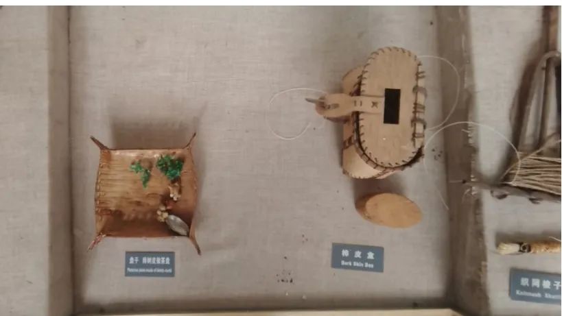 桦树皮工艺:赫哲族人为满足渔猎生产或日常生活的需要,他们不断提高和完善桦树皮工艺。日常生活用的桦树皮制品既有碗、杯、勺、盘、水桶等餐具,也有桦树皮帽、桦树皮盒和桦树皮箱等生活用品,随着木器、铁器、瓷器等生活器皿的传入,桦树皮制品渐次淡出了人们的生活。