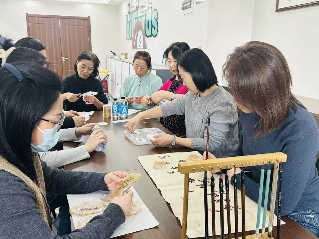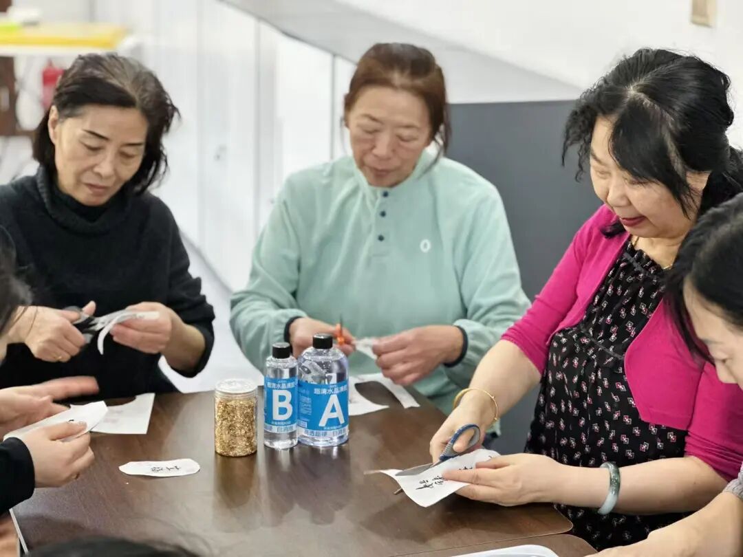 活动现场,书法老师先讲解基础笔法与吉祥文字书写技巧,随后工作人员示范材料搭配、浇筑塑形等步骤。居民们兴致盎然,挥毫写下“福”“安”“吉”等寓意美好的字样,再将书法作品与金箔、闪片等元素融入滴胶,亲手打造独一无二的杯垫。过程中,大家相互交流经验、分享创意,现场氛围温馨融洽。