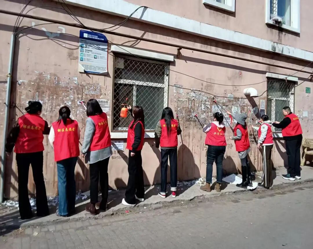 志愿者们深入社区,针对乱贴乱画、楼道杂物、绿化带垃圾及卫生死角等问题,实施精细化、全域化清理整治。志愿者们手持铲子、喷壶等清洁工具,按照区域划分有序开展作业,清理外墙小广告、楼道堆积物和绿化带白色垃圾,在默契配合中实现了居民楼内外、公共活动区域及背街小巷的全方位清洁覆盖。