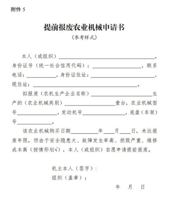 3.对未达报废年限但安全隐患大、故障发生率高、损毁严重、维修成本高的农业机械,经机主书面申请可提前办理报废(见附件5),并申请报废补贴。