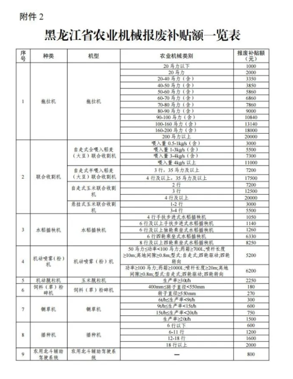 2.黑龙江省农业机械报废补贴额一览表