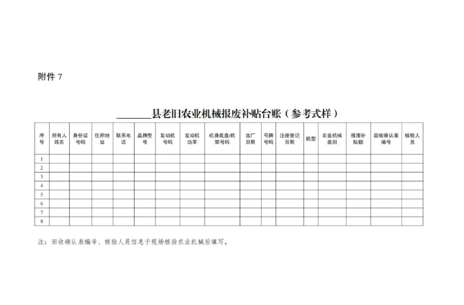 7._____县老旧农业机械报废补贴台账(参考样式)
